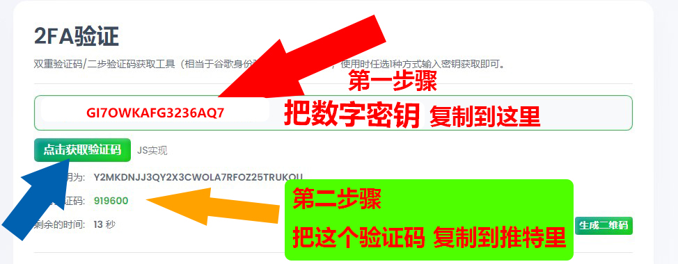 很多客户不明白密钥登陆是什么 【举个例子】! 国内微信登陆是需要手机短信验证码 ,而推特拿只是拿数字密钥就可以生成验证码 就可以了 看下面操作教程 登录教程 【第一步骤】 1 找到登录 已有账号  2 输入账号和密码  第二步 登录推特会见到输入代码  1 打开验证码获取网站:https://2fa.run/ 1 打开验证码获取网站:https://2fa.run/ 1 打开验证码获取网站:https://2fa.run/ 2 通过秘钥获取验证码,如下图,输入密钥–》点击获取验证码–》复制验证码 3 这里获得的验证码就是步骤3中需要输入的验证码  4 【数字的密钥】 已经发给你了 然后生成验证码 后 复制到推特 就可以了 把验证码输入后 点击下一步就可以搞定了  提醒小白 任何 国际app 都必须使用加速器哈 https://docs.xiniujc.com/doc/68/ 登录出错 遇到问题 看教程 :https://docs.mie6693.com/doc/55/