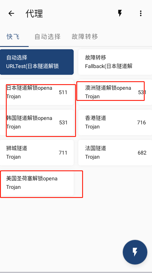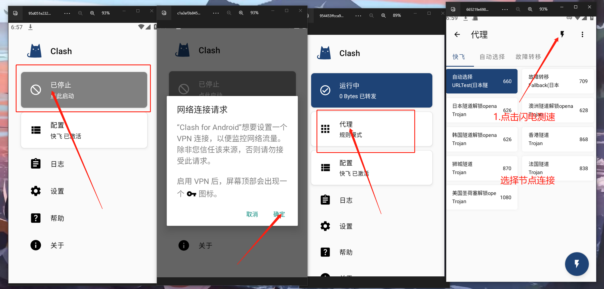 4.3 返回到软件首页 点击启动 再点确定 选择代理 点击右上角闪电测速 选择节点连接就可以了