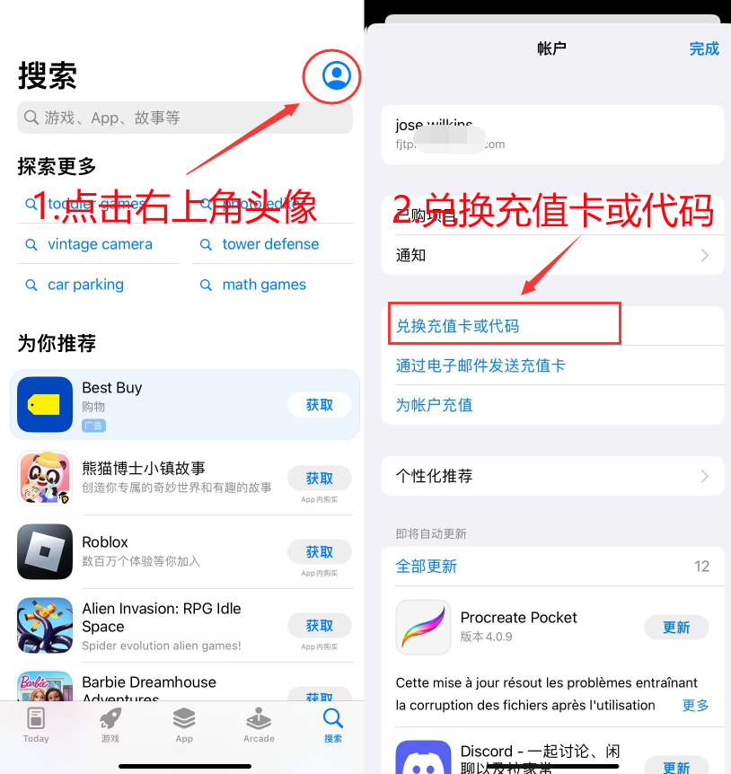 1.打开桌面【app store】,点击右上角头像,点击兑换充值卡或代码