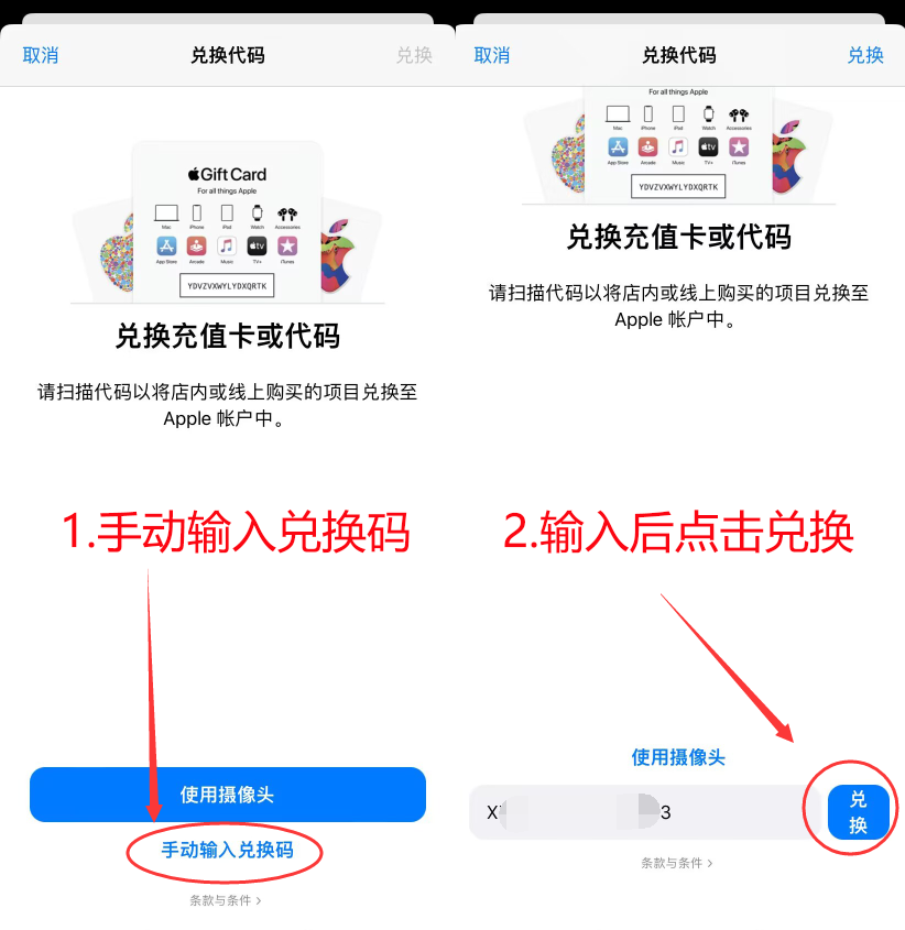 2.点击手动输入兑换码,将购买的礼品卡输入后,点击兑换