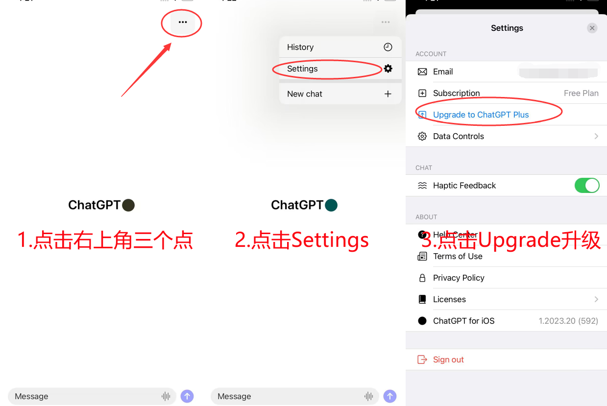 1.打开ChatGPT APP,点击右上角三个点,点击Settings,点击Upgrade to ChatGPT Plus