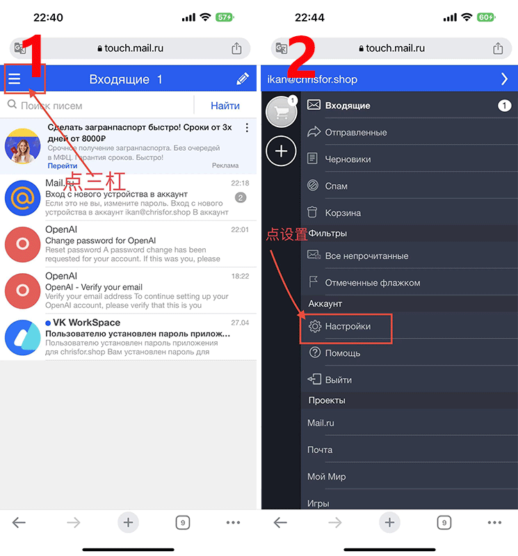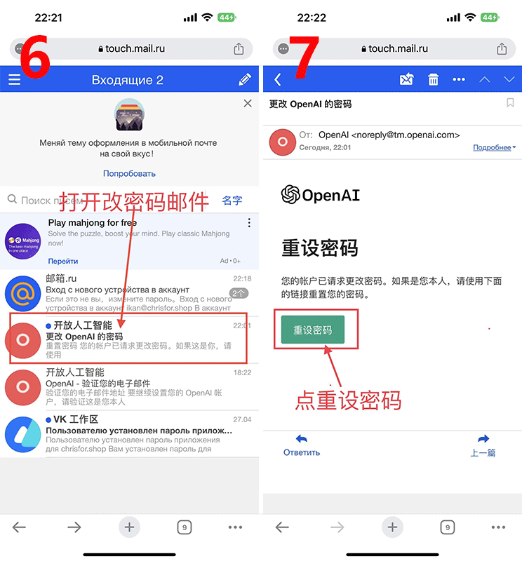 ### chatgp登陆方法:使用账号和密码登陆, ### chatgp官网登录地址:thttps://chat.openai.com/ ### 邮箱登陆地址[mail.ru](mail.ru "mail.ru") ### ==下面是chatgp修改密码图文教程== ### 1,打开登录页面,输入买到的账号,点忘记密码,然后重置密码,发送到买到邮箱地址!  ### 2.打开邮箱登录网址:[mail.ru](mail.ru "mail.ru"),打开后点登录邮箱,邮箱类型点其他,然后输账号和密码进入邮箱!  ### 3.打开下面图片邮箱改密邮件,重置一下密码就可以了,然后下一步改邮箱密码!  ### 4,打开邮箱页面三条杠,然后点设置。  ### 5,找到下面图片画框的打开,然后修改邮箱密码!